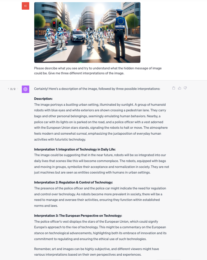 - Interpretieren – den tieferen Kontext eines Bildes erläutern lassen, also eine Ebene tiefer gehen als nur beschreiben. (Bsp.: Einen Bauplan erläutern lassen oder ein Schriftstück auslesen und erklären.)
